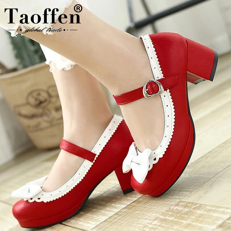 Kopen Goedkoop TAOFFEN Vrouwen Dikke Hoge Hak Schoenen Vrouwen Patchwork Strik Hart Gesp Hakken Pompen Dames Kantoor Dagelijkse Schoenen Maat 28 43 Prijs