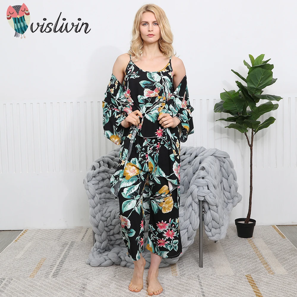 Beste Koop Vislivin 3 stks Pak Gewaad Bloemen Sexy Thuis Pyjama Vrouwen Losse Plus Size Robe Nachthemd Nieuwe Stijl Zomer Nachtkleding Femme gewaad Goedkoop