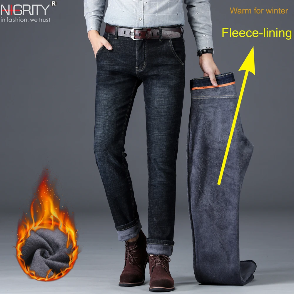 Kopen Goedkoop NIGRITY winter Thermische Warm Mannen Fleece Toevallige Rechte Jeans Stretch dikke Denim Flanel zachte Broek Broek Klassieke plus Size Prijs
