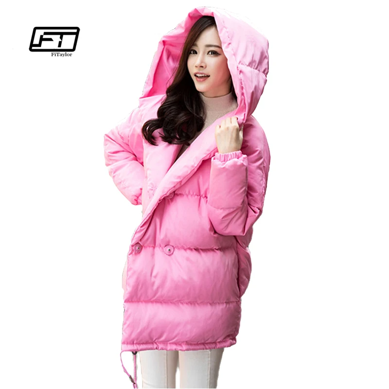 Kopen Goedkoop Winter vrouwen loose fit jas mode schattige parka capuchon overjas medium casual plus size eendendons overjas snowear Prijs