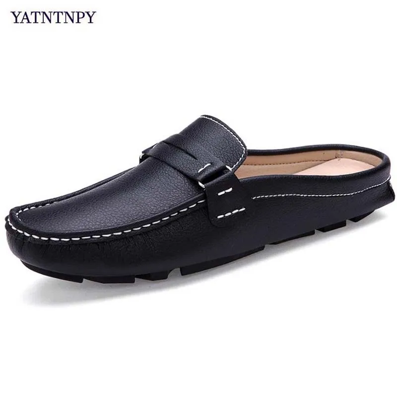 Beste Koop YATNTNPY Brand Schoenen Zomer Casual platte schoenen Man zachte lederen instappers half slippers Mannen comfortabel rijden Loafers Goedkoop