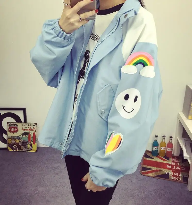 Beste Kopen Lente herfst Harajuku cartoon afdrukken losse vrouwen regenboog Cartoon Brief Print jacket Goedkoop