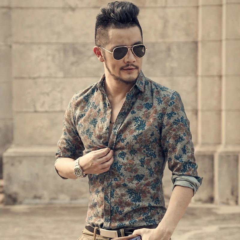 Kopen Goedkoop 2017 Mannen Shirts mode nieuwe stijl hoge kwaliteit casual katoen gedrukt bloem shirts mannen lange mouwen Single Breasted Slim shirts Prijs
