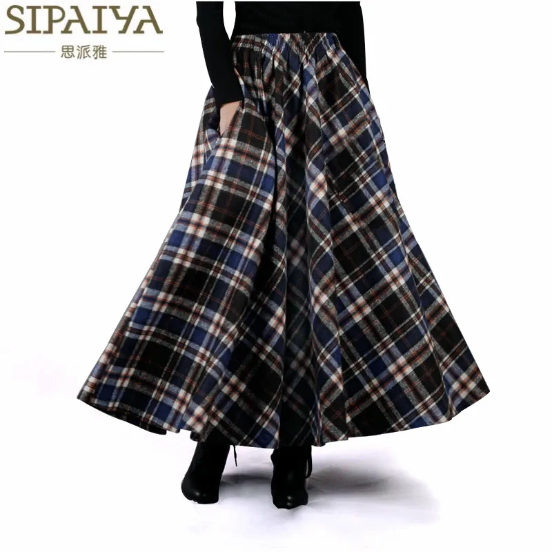 Kopen Goedkoop 2017 Herfst Winter Vrouwen Rok 50 s Vintage en Retro Wol Maxi Elastische Taille Plaid Klassieke Dikke Warme Saias Longa Prijs