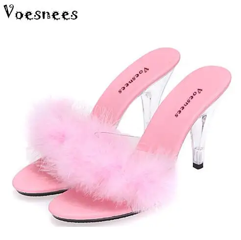 Kopen Goedkoop Schoenen Vrouw Zomer Sandalen Veer Slides Hoge hakken 7 10 cm Model Catwalk Transparant Glas Kristal Luipaard Slippers Prijs