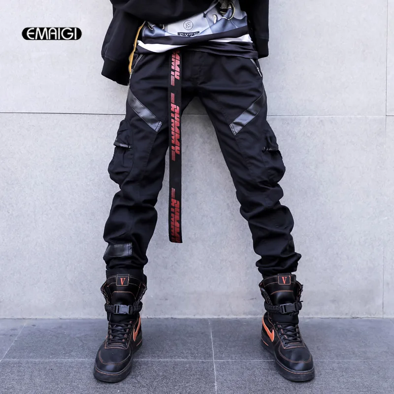 Kopen Goedkoop Mannen Hoge Street Fashion Leather Pocket Splice Casual Cargo Pant Mannelijke Hip Hop Harembroek Lange Broek Prijs