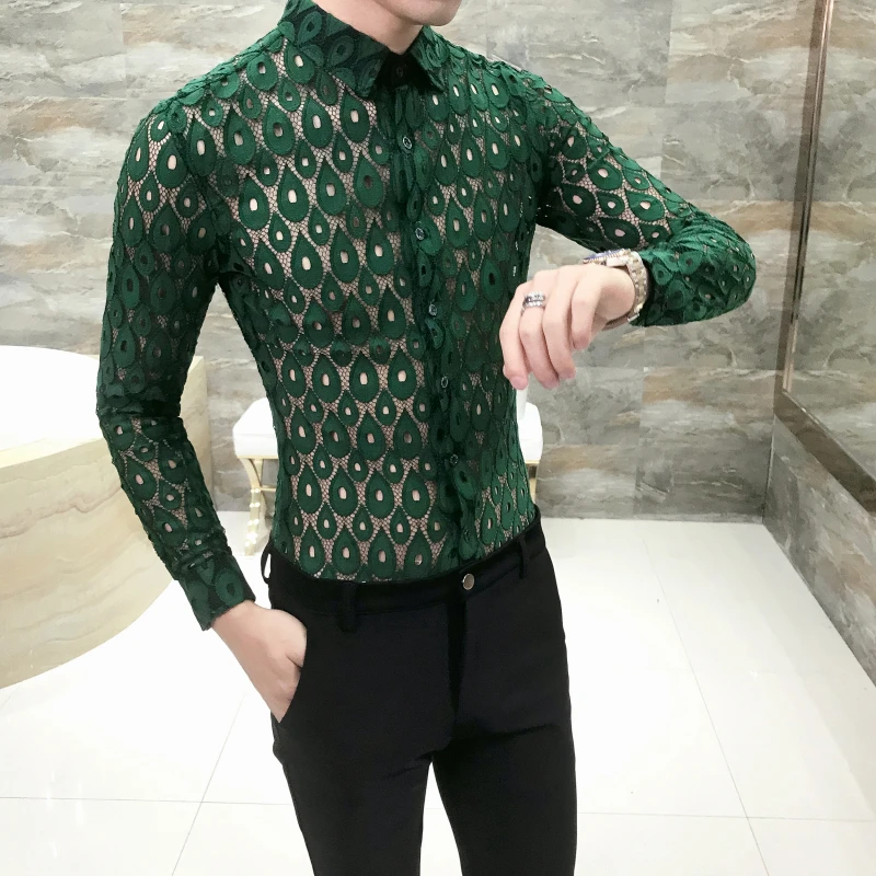 Goede Kopen Rain Drop Transparant Shirt Mannen Luxe Wedding Party Shirt Mannen Slim Fit Shirt Camicia Uomo Zwart Groen See Through Sexy shirt Goedkoop
