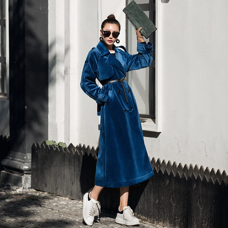 Goede Kopen VERRAGEE vintage groen blauw effen kleur 2018 nieuwe vrouwen fluwelen lange Herfst Winter double breasted retro losse effen trenchcoat Goedkoop