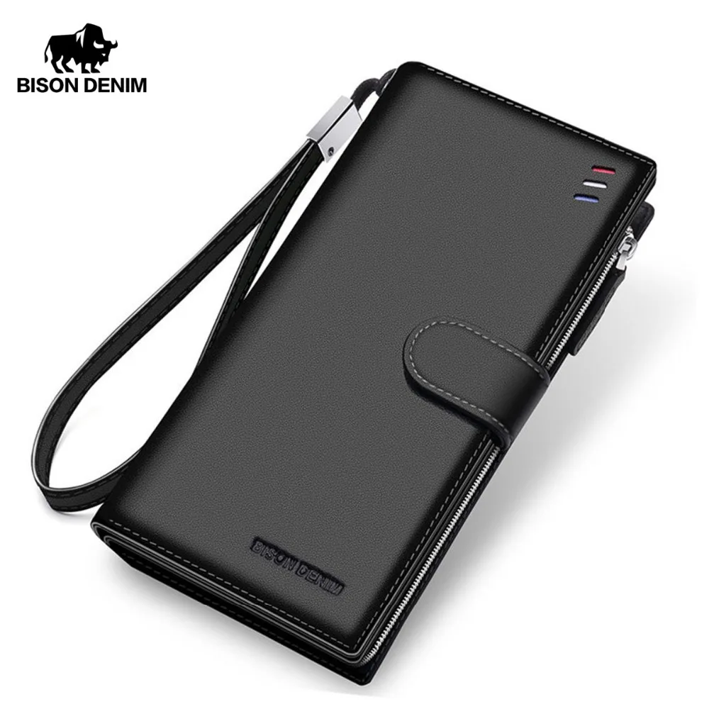 Beste Koop BISON DENIM Luxe Merk Mannen Portemonnee Koeienhuid Lederen heren Portemonnee Rits Pocket Hoge Kwaliteit Mannelijke Clutch Echt Lederen Portemonnee mannen Goedkoop