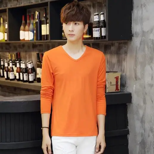 Beste Koop 2018 herfst mannen t shirt lange mouwen candy effen kleur trui V hals dieptepunt shirt Goedkoop