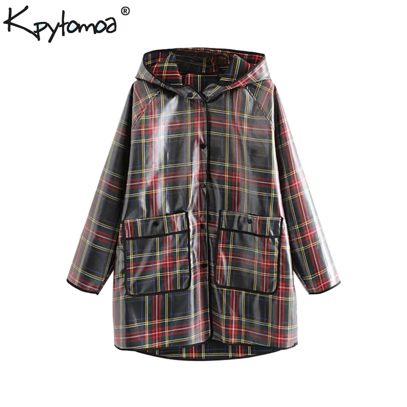 Kopen Goedkoop Vintage Chic Zakken Plaid Losse Regenjas Vrouwen 2018 Mode Hooded Kraag Lange Mouwen Dames Bovenkleding Toevallige Waterdichte Jas Prijs