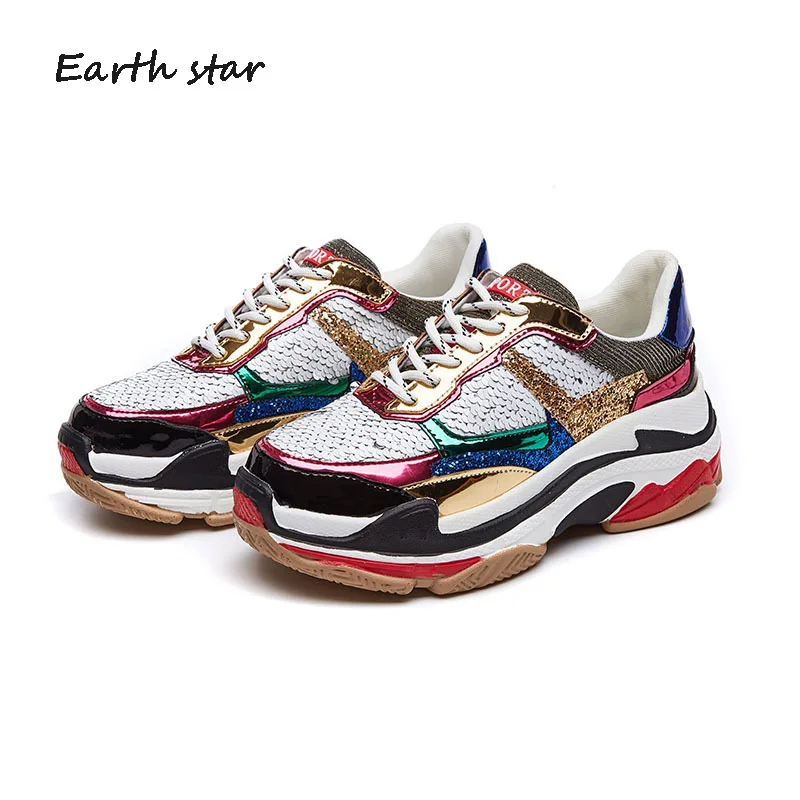 Goede Kopen AARDE STER Herfst Meisje Nieuwe Mode Merk Schoenen Vrouwen Glitter Sneakers Cross gebonden Pailletten Dame Platform Schoenen Bling Ademend Goedkoop