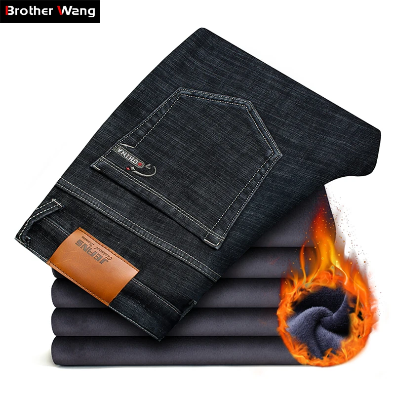 Kopen Goedkoop 2018 Winter Nieuwe mannen Warme Zwarte Jeans Elasticiteit Slim Fit Thicken Denim Broek Merk Broek Mannelijk Bule Big Size 38 40 42 44 46 Online