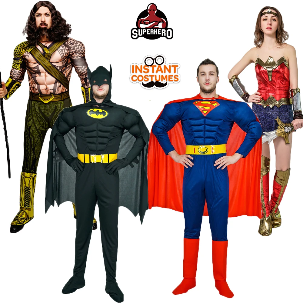 Beste Kopen Nieuwe Collectie Superhero Mannelijke Kostuums Maskerade Super man Batman Aquaman Cosplay Spier Superhero Kostuums voor Volwassenen Goedkoop