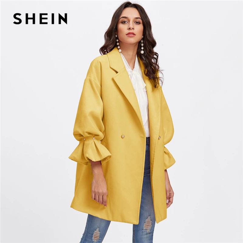 Kopen Goedkoop SHEIN Geel Kantoor Dame Elegante Drop Schouder Parel Detail Ruffle Manchet Highstreet Jas Herfst Vrouwen Minimalistische Werkkleding Kleding Online