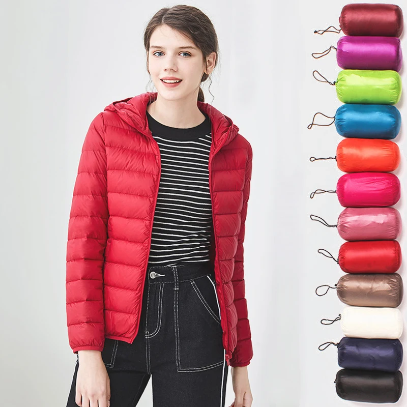 Kopen Goedkoop Donsjack vrouwen hooded 95% duck down jas Ultra Licht warm grote maat Vrouwelijke Effen Draagbare stand kraag donsjack winter Prijs