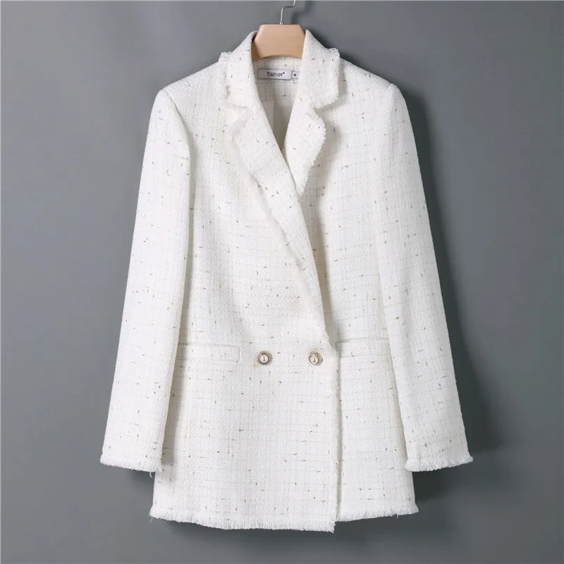 Kopen Goedkoop Vrouwen Wit Tweed Lange Blazer Pak Vrouwen Double Breasted Lange Mouwen Kantoor Jas Lady Herfst Casual Jassen Uitloper Talever Online